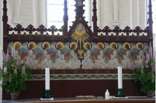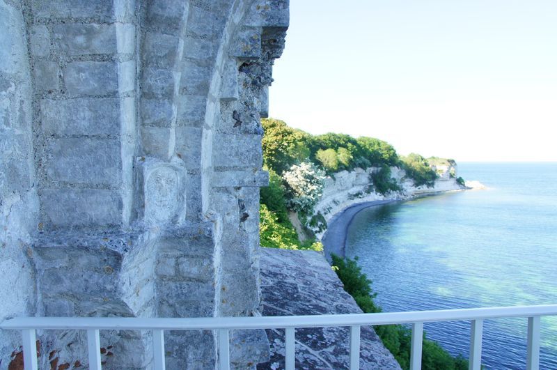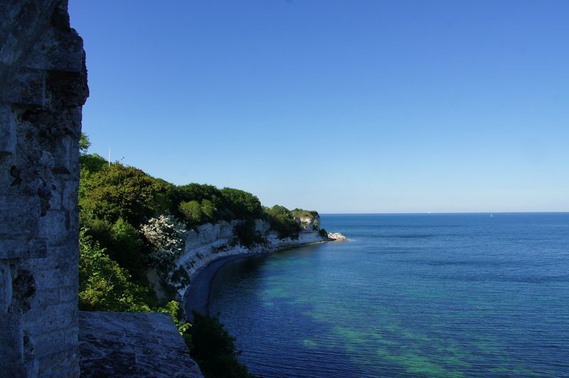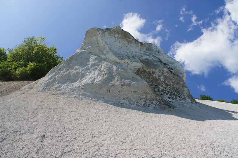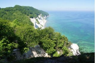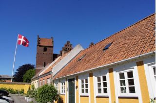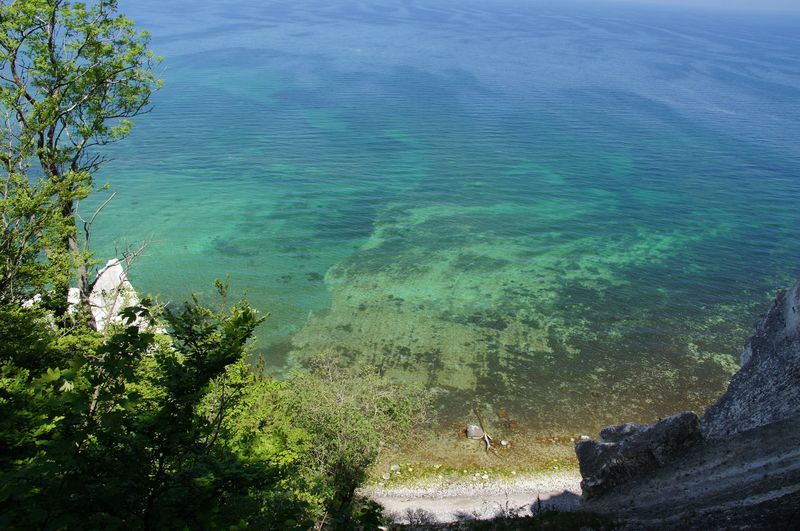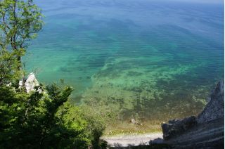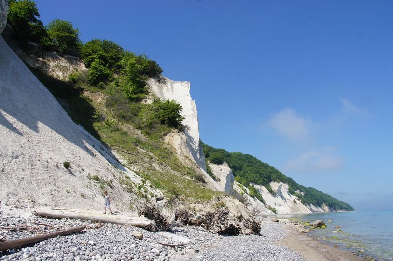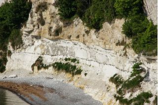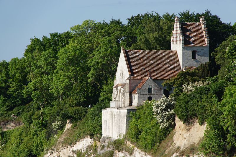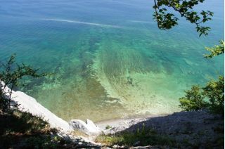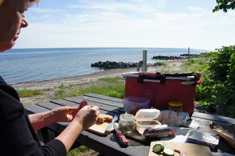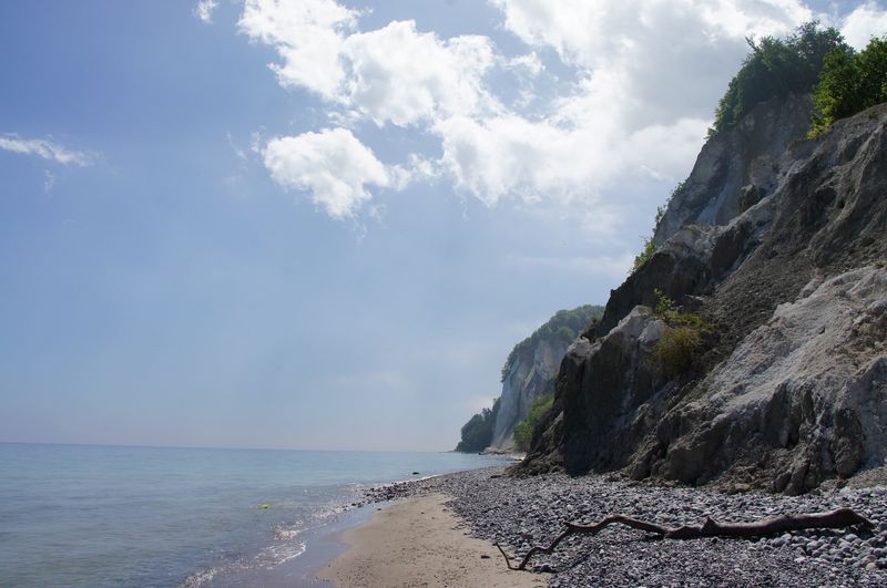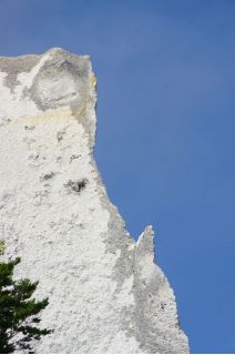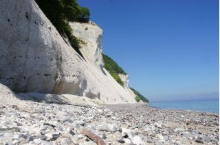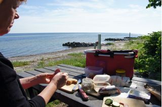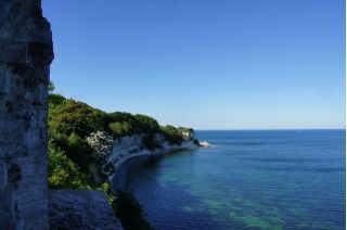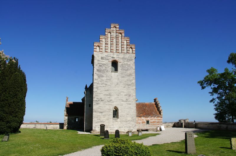 Wir kletterten noch einmal eine lange Treppe zum Strand, mit seinem beeindruckend, blendend weißen Kreidewänden hinunter und hinauf. Durch die sommerlich stille Landschaft gingen wir zurück und fuhren in Richtung Stevns Klint mit siner alten, am Abhang stehenden Kirche. Auch dort kraxelten wir noch einmal zur Kreide und Kalkküste hinunter. Windstille und ein zauberhaftes Licht begleiteten uns in die Nacht. Gleich bei der Kirche gab es einen Wiesenparkplatz für unsere fast einsame, ruhige Übernachtung.