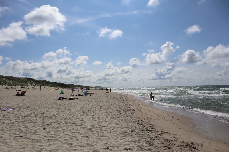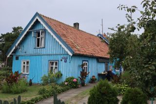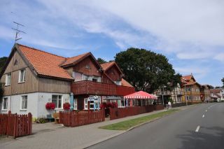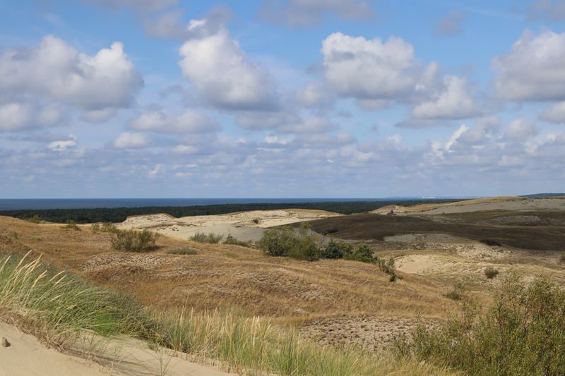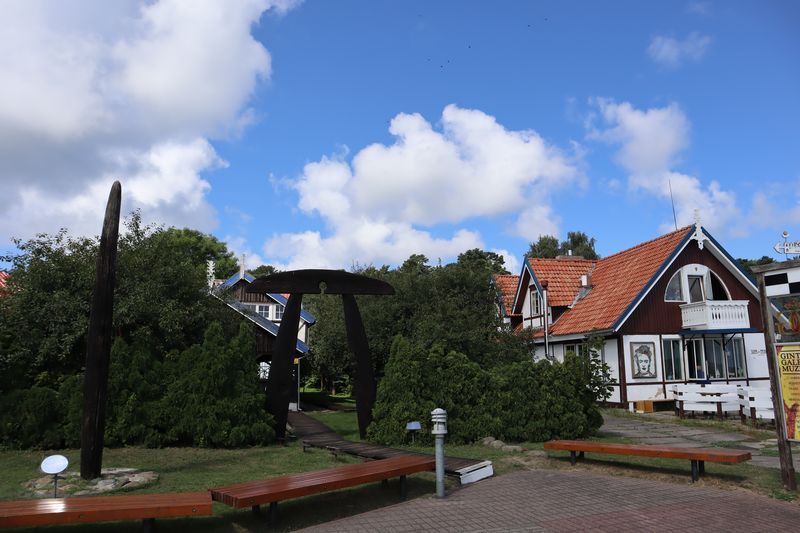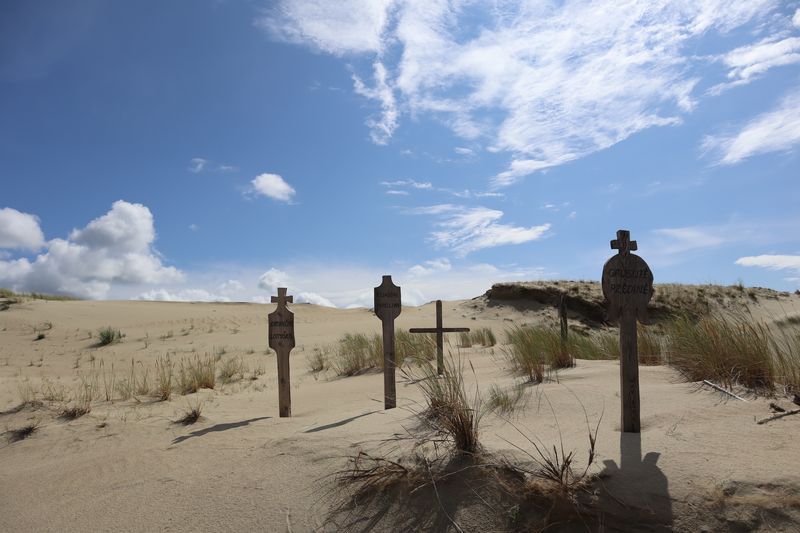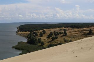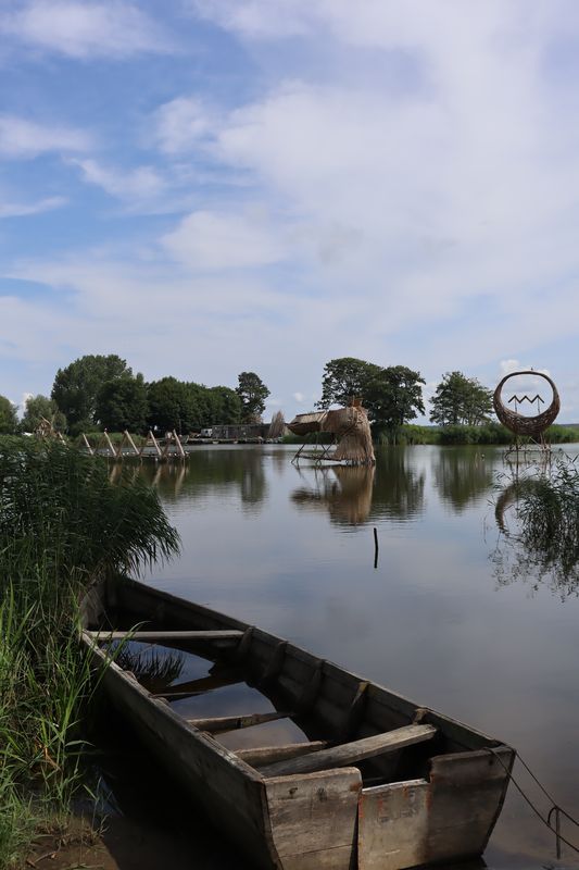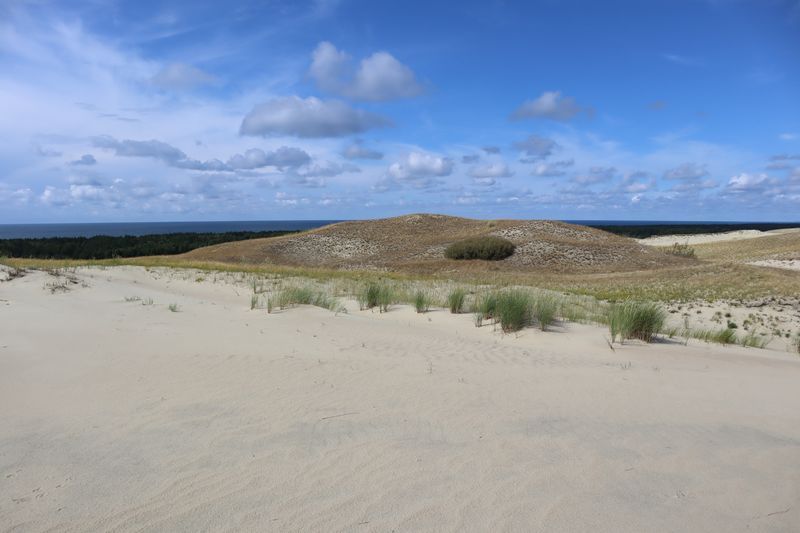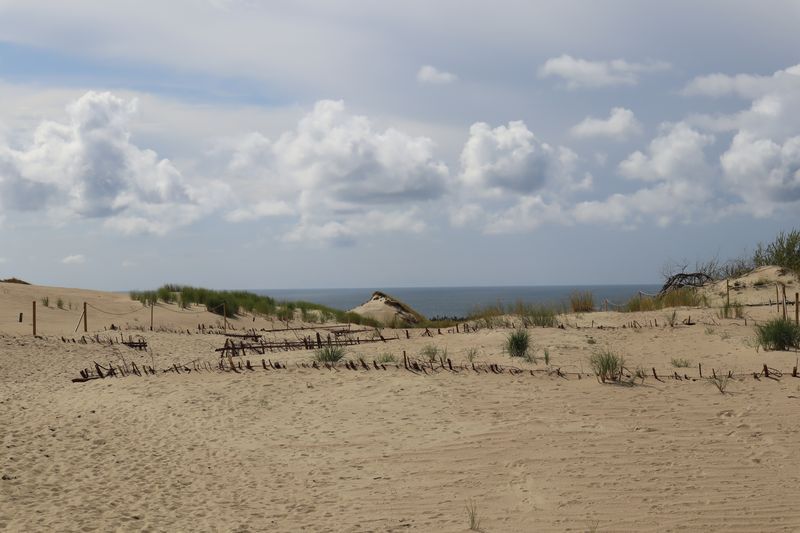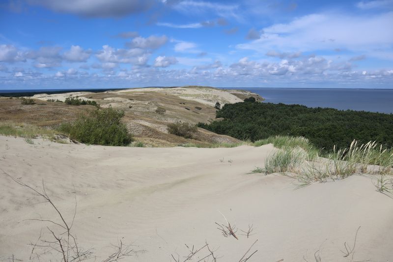 Wir wollen am Mittwoch die Kurische Nehrung noch etwas näher erleben und laufen auf der Boddenseite vorbei an der Bernsteinbucht mit tollen Holzskulpturen in den kleinen Ort Juodkrante. Die Strandpromenade zieren viele sehr schöne Steinskulpturen und wir bekommen einen kleinen Hunger, nicht wegen der Skulpturen, sondern wegen der langgezogenen Ortschaft. Es ist aber nicht langweilig. Es gibt viele hübsche Häuser und eine kleine Steinkirche zu bewundern. An einem Fischverkauf direkt an der Straße werden wir sehr nett beraten und kaufen frisch geräucherten Wels. Etwas südlich liegt die große Schwarz Ort Düne zu der wir in der wunderbar warmen und würzigen Nachmittagsluft hinauf steigen. Hier findet man auch die Reste eines versandeten Fischerdorfes.