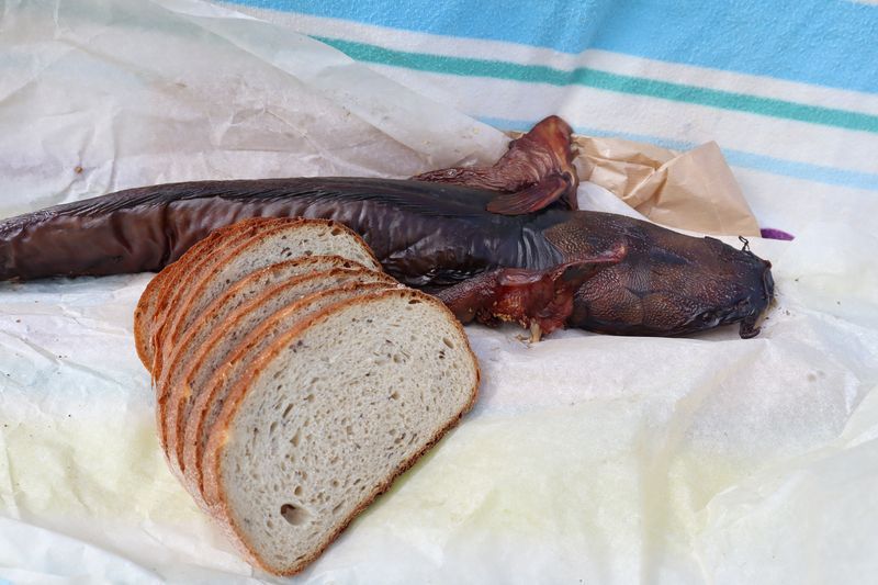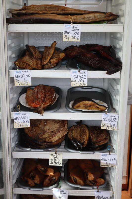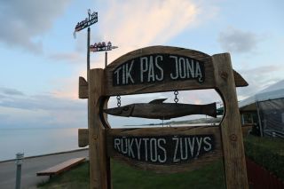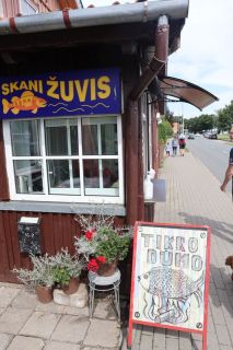 Nun wird es Zeit für unser Fischessen und wir finden einen netten Platz vor dem Binnenleuchtturm vor Pervalka. Der am Morgen geräucherte kleine Wels wird restlos verputzt, oh wie lecker!