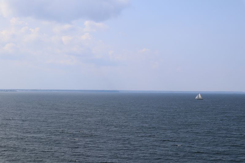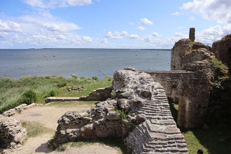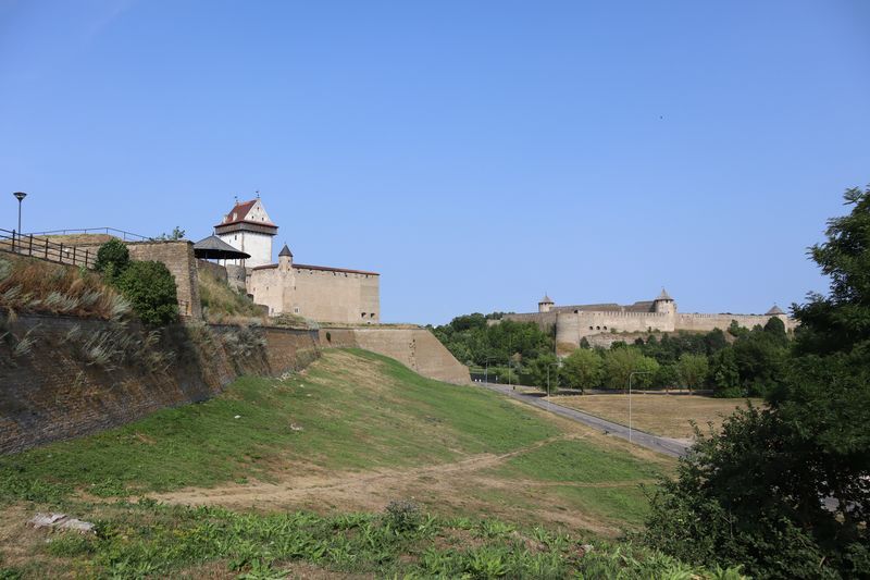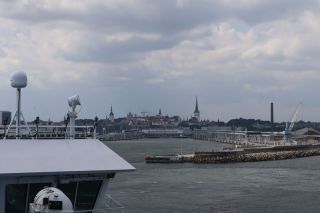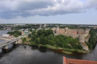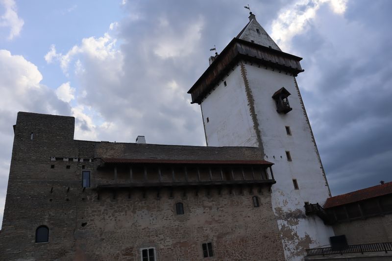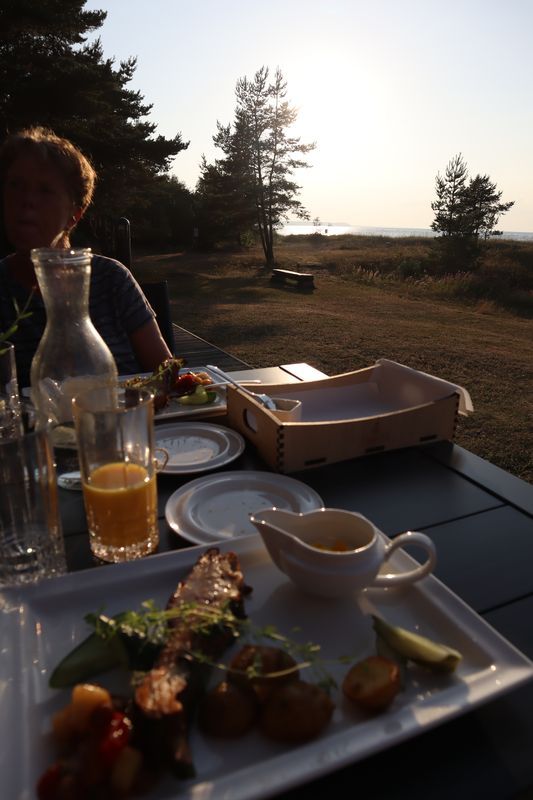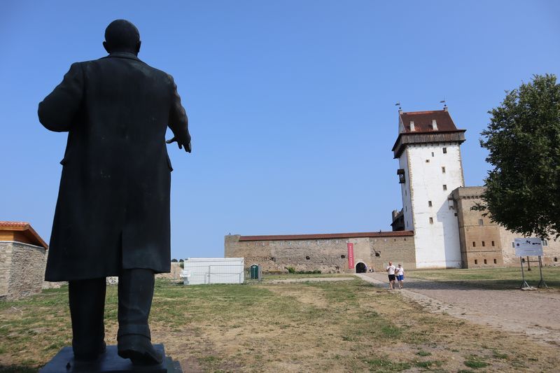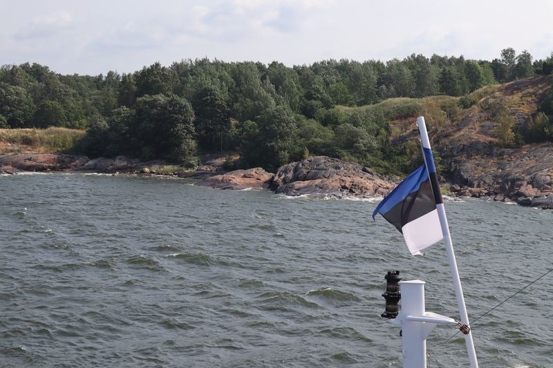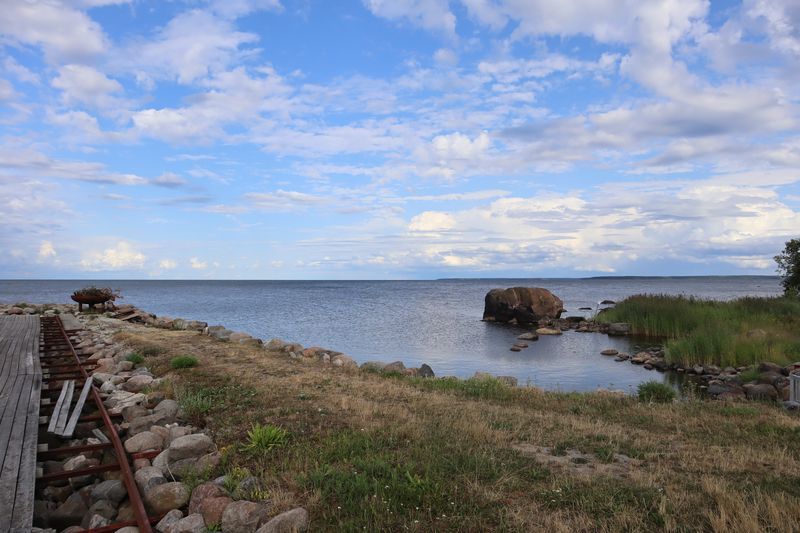 Am Sonntag mussten wir halb zehn am Fährterminal sein. Die Viking Line Fähre kam auch pünktlich. Bald fuhren wir in den Bauch des riesigen Schiffes und brummten, Helsinkis Hafenansicht vom Heck aus betrachtend, zwischen einigen Schären in Richtung Tallinn. Nach reichlich zwei Stunden begrüßte uns die estnische Hauptstadt in der Mittagssonne mit seiner markanten Altstadtansicht, besonders der weithin sichtbaren Spitze der St. Olafskirche, einem uralten Seezeichen. Der Tag sollte uns weiter über die Schnellstraße in Richtung Ostgrenze nach Narva bringen. Wir wollten die Zeit in Estland von dieser Seite her beginnen. Wir parkten neben der alten Burg, direkt neben der Grenze zu Russland. Auf der anderen Seite des Narva Flusses steht die alte Festung Iwangorod. Über den Festungsvorhof der Narvaburg gehend, auf dem die letzte Leninskulptur Estlands in Richtung Grenzbrücke zeigt, entschlossen wir uns das Burgmuseum zu besuchen. Das war dann doch sehr interessant, ein Fahrstuhl brachte uns auf die Turmaussicht mit seinem hölzernen Wehrgang. Von der Geschichte des Grenzortes beeindruckt fuhren wir wieder zurück in Richtung Westen, durch ein rauschendes Sommergewitter hindurch, unser Auto war auch gleich entstaubt. Wir fanden einen traumhaft schönen Campingplatz am Meer und starteten noch zu einer Strandwanderung, mit dem Ziel eines netten Restaurants und leckerem Essen mit Meerblick und Aussichtsturm.