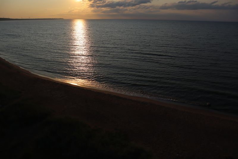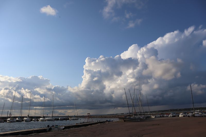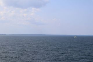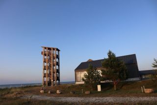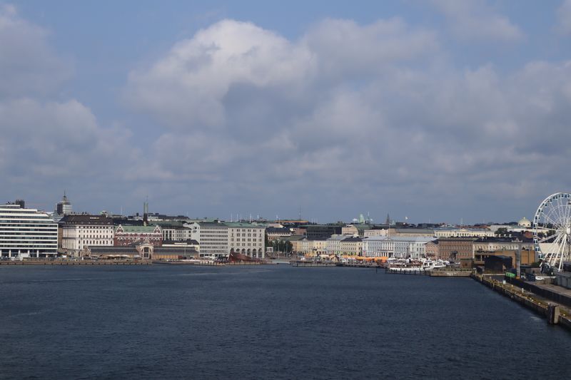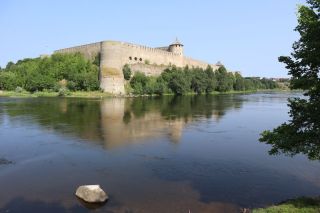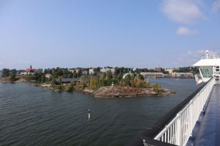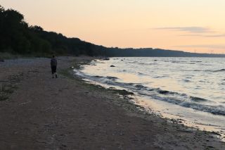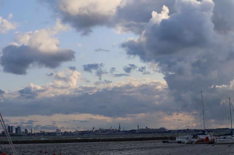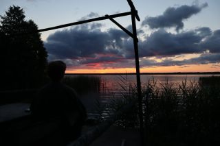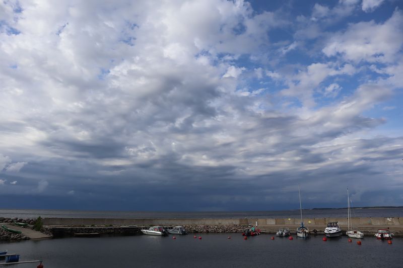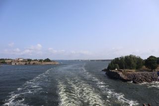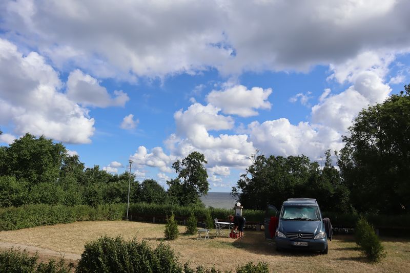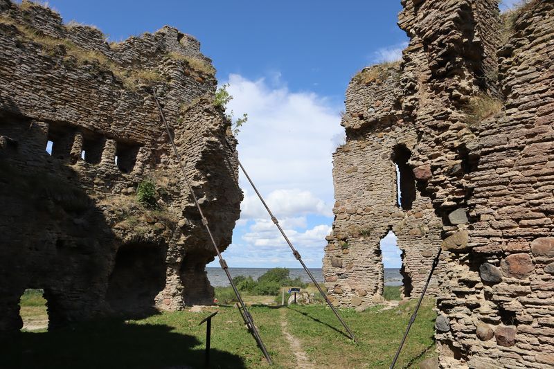 Am Sonntag mussten wir halb zehn am Fährterminal sein. Die Viking Line Fähre kam auch pünktlich. Bald fuhren wir in den Bauch des riesigen Schiffes und brummten, Helsinkis Hafenansicht vom Heck aus betrachtend, zwischen einigen Schären in Richtung Tallinn. Nach reichlich zwei Stunden begrüßte uns die estnische Hauptstadt in der Mittagssonne mit seiner markanten Altstadtansicht, besonders der weithin sichtbaren Spitze der St. Olafskirche, einem uralten Seezeichen. Der Tag sollte uns weiter über die Schnellstraße in Richtung Ostgrenze nach Narva bringen. Wir wollten die Zeit in Estland von dieser Seite her beginnen. Wir parkten neben der alten Burg, direkt neben der Grenze zu Russland. Auf der anderen Seite des Narva Flusses steht die alte Festung Iwangorod. Über den Festungsvorhof der Narvaburg gehend, auf dem die letzte Leninskulptur Estlands in Richtung Grenzbrücke zeigt, entschlossen wir uns das Burgmuseum zu besuchen. Das war dann doch sehr interessant, ein Fahrstuhl brachte uns auf die Turmaussicht mit seinem hölzernen Wehrgang. Von der Geschichte des Grenzortes beeindruckt fuhren wir wieder zurück in Richtung Westen, durch ein rauschendes Sommergewitter hindurch, unser Auto war auch gleich entstaubt. Wir fanden einen traumhaft schönen Campingplatz am Meer und starteten noch zu einer Strandwanderung, mit dem Ziel eines netten Restaurants und leckerem Essen mit Meerblick und Aussichtsturm.