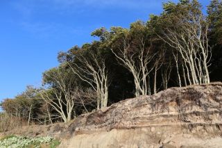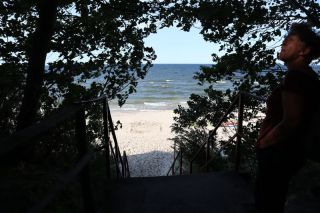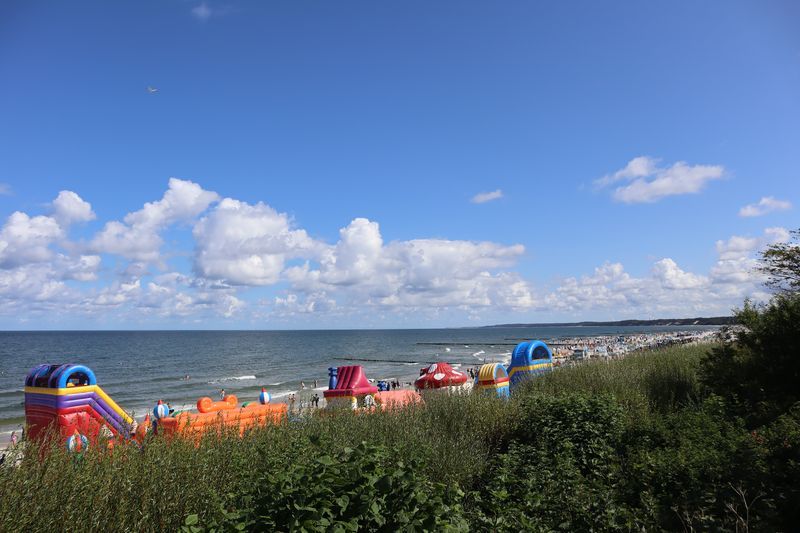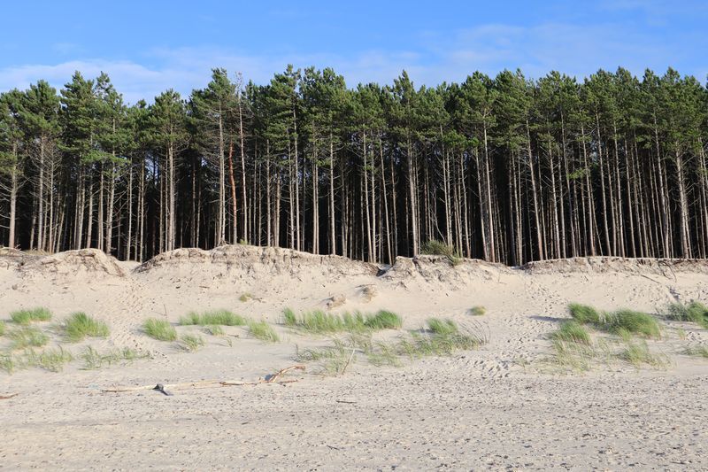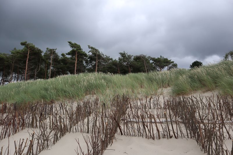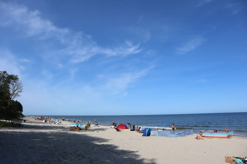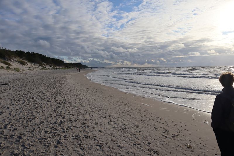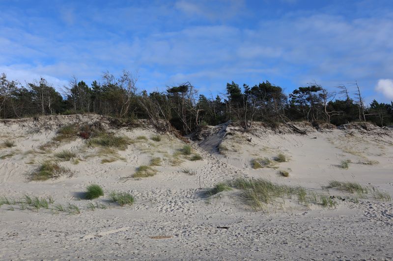 Am Freitagvormittag packen wir nach leckerem Himbeerquarkfrühstück und fahren wieter in Richtung Westen. Wir haben uns einen Campingplatz am Meer ausgesucht, landen in Rowy. Der vermeintlich stille Ort an der Küste entpuppt sich als Urlaubereldoroado mit vielen Ferienwohnungen, zwei weiteren Campingplätzen und einer gut aufgestellten Sommerurlaubsmaschine. Wir werden versöhnt mit einem breiten Sandstrand und noch einmal abwechslungsreicher Küstenlandschaft mit Krüppelkiefern und kleinen Windflüchterbuchen an der Steilküste. Die weite, brausende Ostsee hat uns müde gemacht.