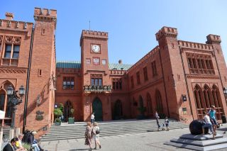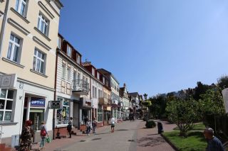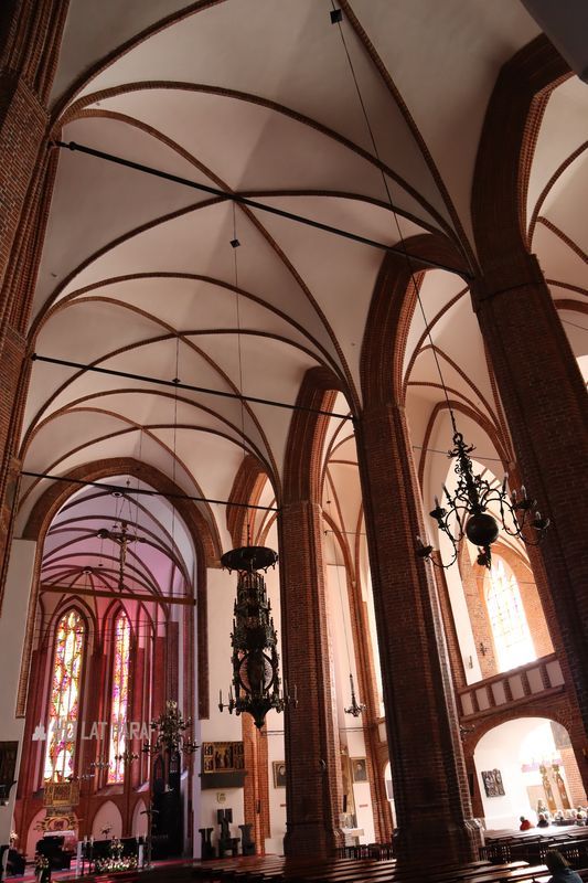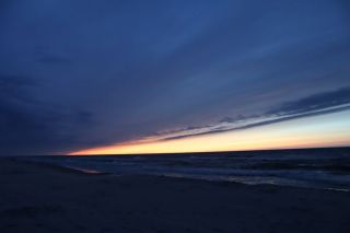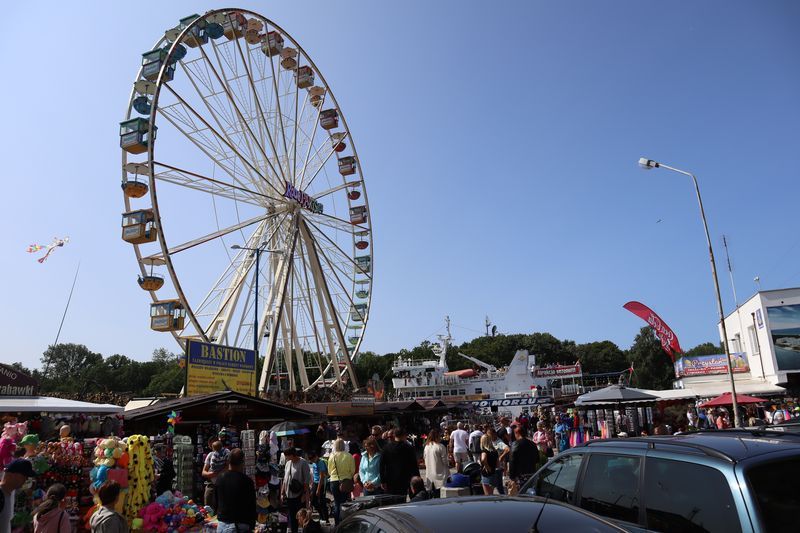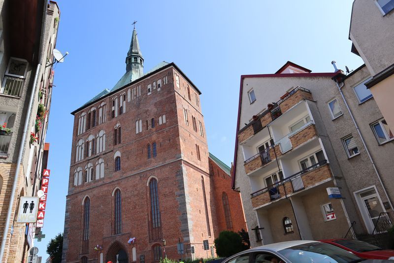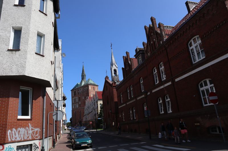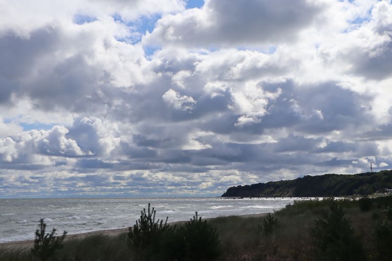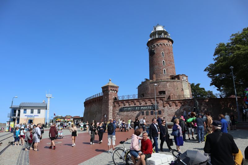Das Ostseewetter schiebt am Abend eine graue Wolkenschicht in den goldenen Sonnenuntergang. Eine letzte Nacht auf dem schönen Platz am Meer bringt Sonne am Morgen und wir fahren nach Kolberg. Zuerst sehen wir uns den Altstadtkern mit dem alten Luntenturm und der riesigen Backsteinkirche St. Marien an. Das trutzige, neugotische Rathaus ist ein Bau des Architekten C. F. Schinkel, sehr schön restauriert. Wir können zu Fuss in Richtung Küste und Hafen laufen und drängeln uns einmal um den Backsteinleuchtturm herum an einigen schönen Bäderbauten vorbei. Der Hafen ist ein großer Rummelplatz, die vielen polnischen Ostseeurlauber genießen ihre Ferien.