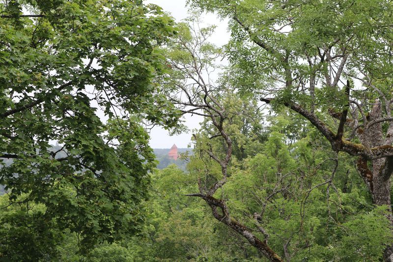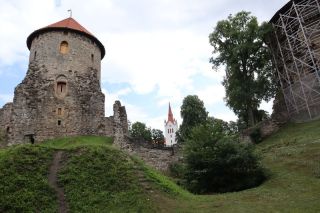 Wir fahren noch einmal in der Bucht von Pärnu entlang bis zu einem kleinen Campingplatz, Takhuranna. Auf dem liebevoll eingerichteten Platz entschließen wir uns einen Waschtag einzulegen und fahren am Freitag entlang der Küste. In einer kleinen Bäckerei nehmen wir mit süßem Gebäck Abschied von Estland, halten kurz an der Landstraßengrenze zu Lettland, die durch eine alte Steinmole, fünf Häuser und sieben Störchen zu erkennen ist. Die schmale Küstenstraße schnürt immer noch schön an der brausenden Ostsee entlang, dass macht Lust auf ein erfrischendes Bad. Auf der Karte und im Reiseführer haben wir vom Gauja Nationalpark erfahren, er liegt etwas von der Küstenroute entfernt. Wir wollen uns die Zeit nehmen und erreichen zwischen einigen Regenschauern die kleine Stadt Cesis. In der trutzigen Katharinenkirche begrüßt uns ein Restengel eines alten Barockaltars und eine Turmaussicht bietet Rundblicke über die Dächer der charmanten Altstadt.