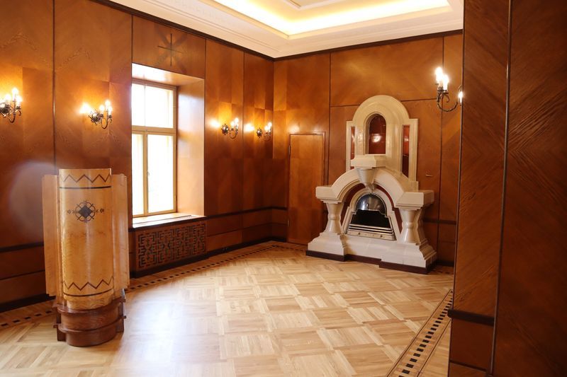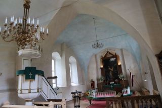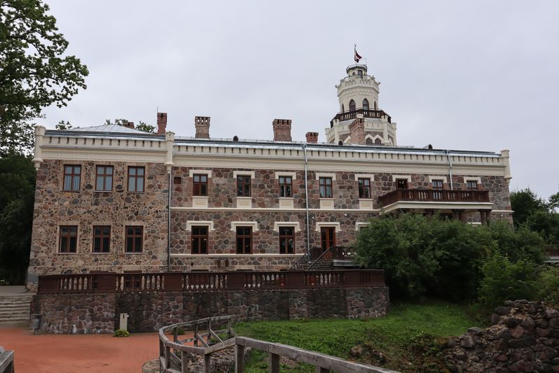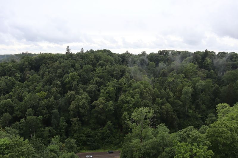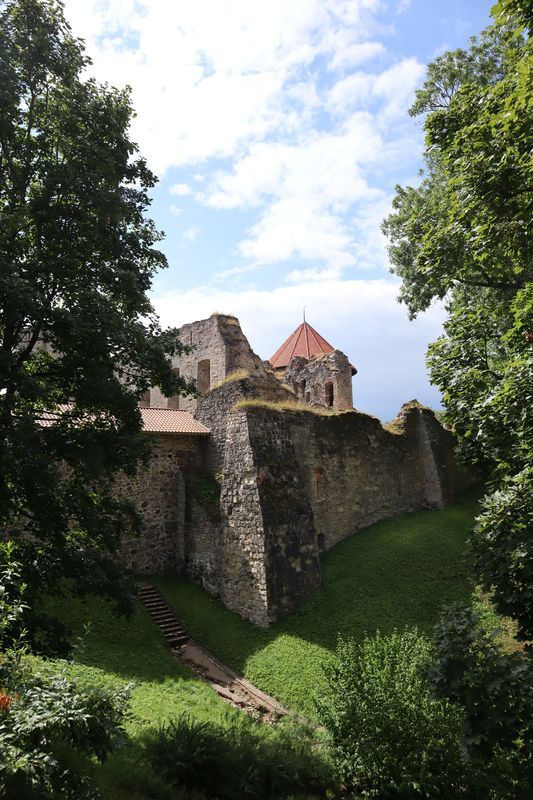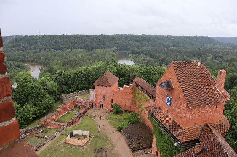 Heute Morgen wollen wir noch die kleine Stadt Sigulda besuchen. In der evangelischen Kirche gibt es einen netten Begrüßungstisch, Knopfkunst hinter der Orgel und einen Blick vom Turm. Unweit besichtigen wir noch die Burgruine des Livländischen Kreuzritterordens und das frisch renovierte neue Schloss mit seinen wertvoll ausgestatteten Innenräumen. Wir durchqueren noch einmal das Tal. Vom Turm des neuen Schlosses haben wir schon die Mauern der Burgruine Treiden gesehen. Vom dicken Turm aus haben wir eine schöne Rundsicht über das Flusstal. Dicht dabei befindet sich das Freilichtmuseum Krimulda, hier wird die Geschichte der alten Liven sehr anschaulich dargestellt. Direkt an der Straße kann man noch einmal eine Sandsteinhöhle bewundern. Der regnerische Tag hat sich doch wieder einmal ereignisreich gezeigt. Die gerade Straße A2 bringt uns unerwartet schnell nach Riga. Wir landen auf dem City Camp Riga mitten im Zentrum der Stadt und es regente auch nicht mehr.