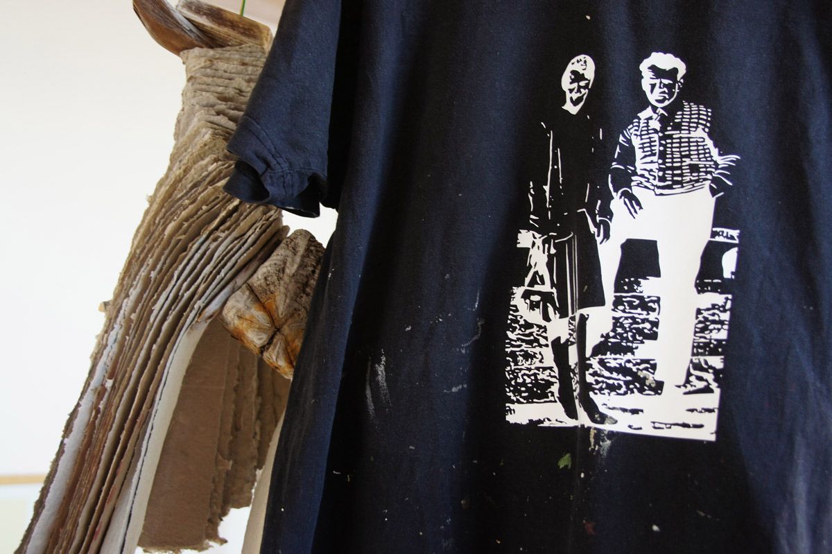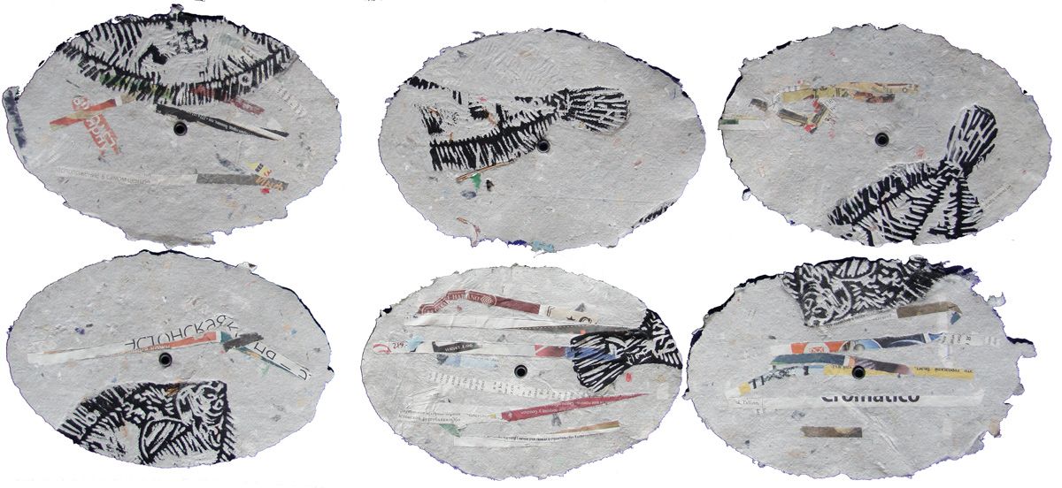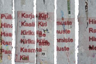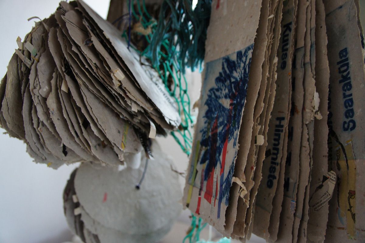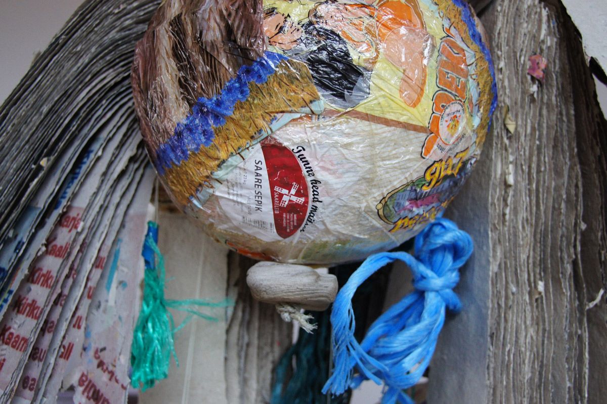 handgeschöpfte Papiere aufgefädelt an gefundenem Draht und Seil, Holz, Stein und Seilreste, Baumwoll T-Shirt bedruckt, Acrylglaskugel collagiert mit Kunststofftüten, Holzdruckstöcke, frei hängend im Raum: 120 x 80 x 80 cm