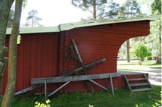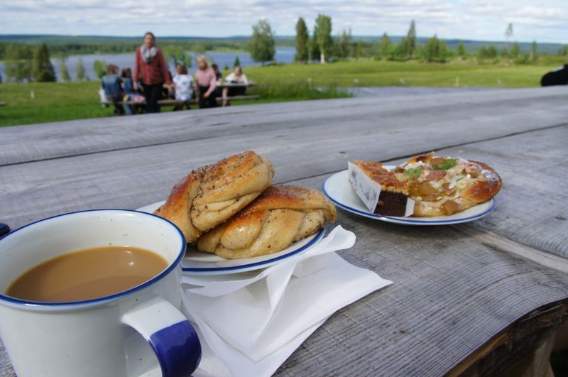 Am Sonntag war es nötig einmal etwas Wäsche auf dem Campingplatz zu waschen und während die Sachen im warmen Sommerwind trockneten, fuhren wir noch einmal ein Stück ins Land hinein zu einem der beliebten Sommercafés. Idyllisch, in einer Scheune an einem See gab es leckere Kardamomschnecken und dünnen, schwedischen Milchkaffee. Auf dem Rückweg machten wir noch in Bureå Halt. In dem Ort befindet sich auch unser Campingplatz vom Wochenende. Bei einem kleinen Freilichtmuseum entdecken wir eine, der hier an der Küste zu findenden, alten Fischerkirchen und an der Seitenwand des kleinen Veranstaltungspavillions stand der trockene Mittsommerbaum aus einer coronafreien Zeit.